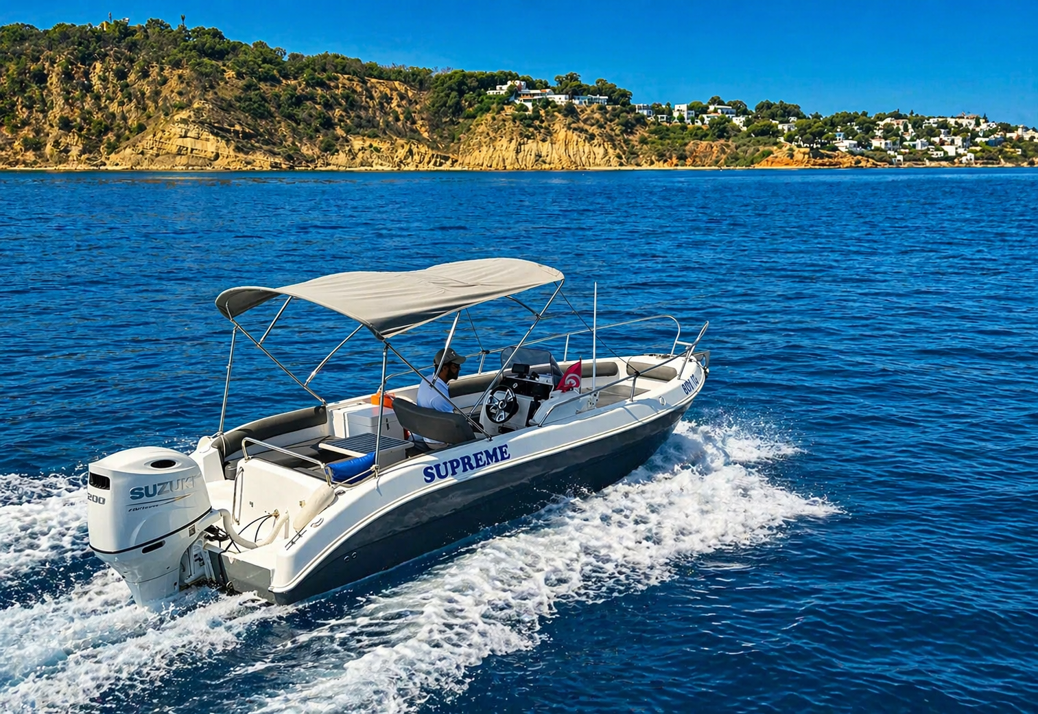 Profitez d’une escapade dynamique en mer à bord du Supreme, un bateau à moteur rapide au départ de Sidi Bou Saïd, idéal pour allier plaisir et accessibilité.